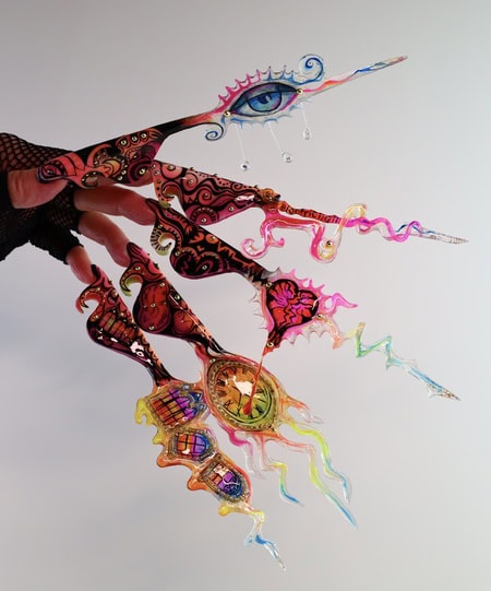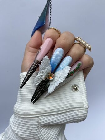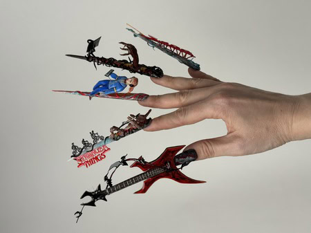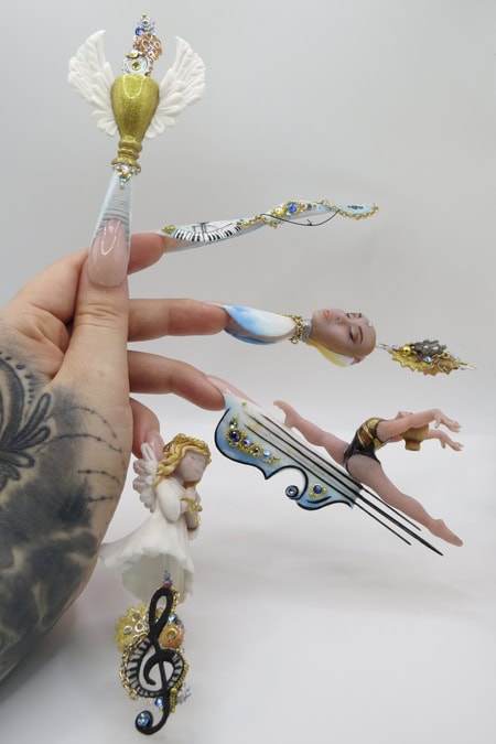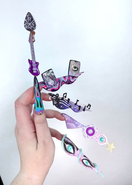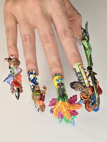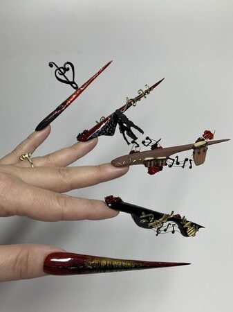 Create a five-nail design that functions like five movements of a musical composition. Each nail should have its own beauty, but the overall design must form a cohesive visual story. Nails can be whatever shape desired, and the minimum length of each should be 5cm from the cuticle area to allow sufficient space for detail.