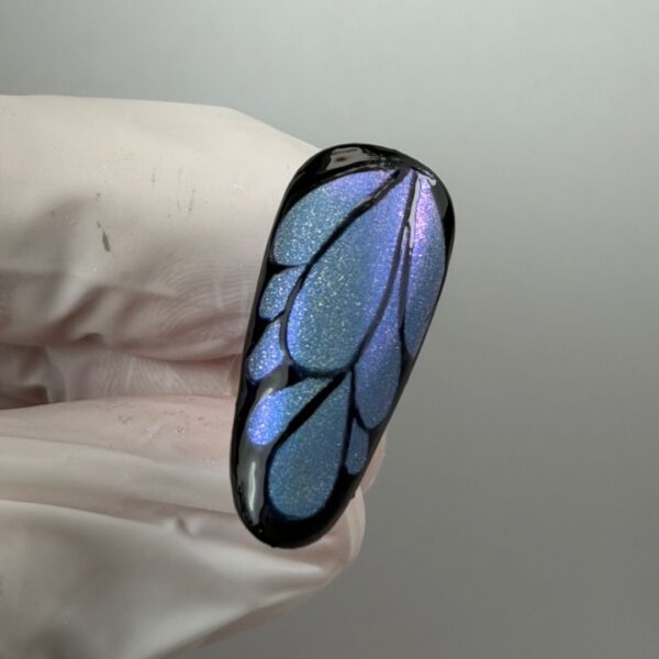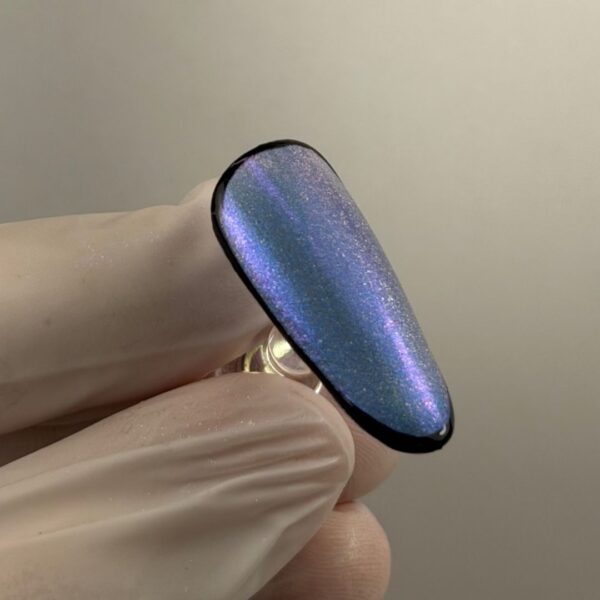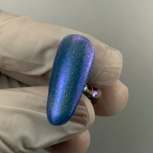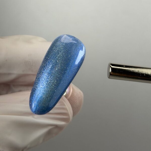 Apply a blue cat eye gel polish. Before curing, use a magnet to manipulate the magnetic particles to create the desired reflection. Cure.