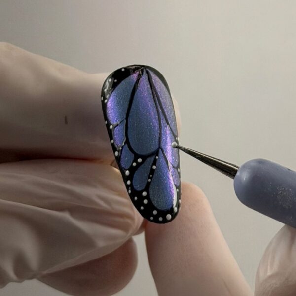 Using a dotting tool and white art gel, add small dots to any black gel paint areas. Cure.