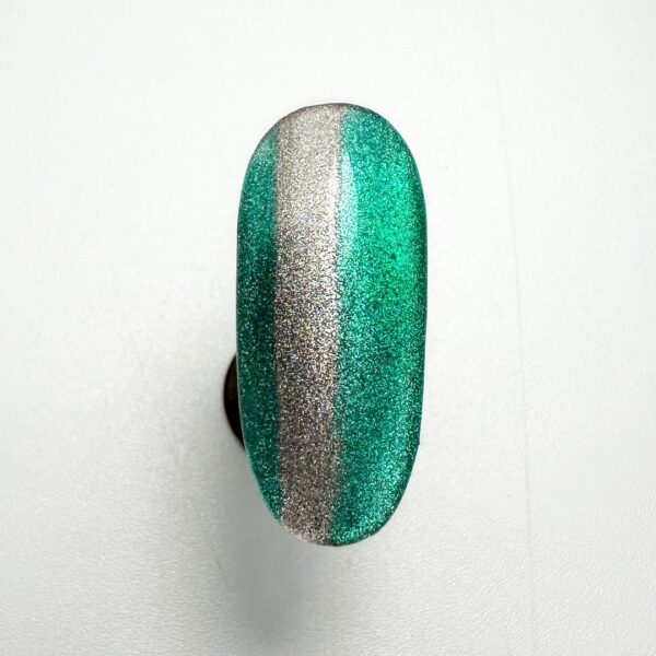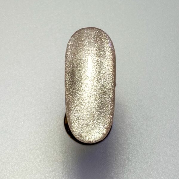 Prep the nails and apply a coat of Champagne-coloured or white cat eye gel polish. Cure, apply a second coat and use a magnet to gather a line of shimmer in the centre of each nail. Cure.
