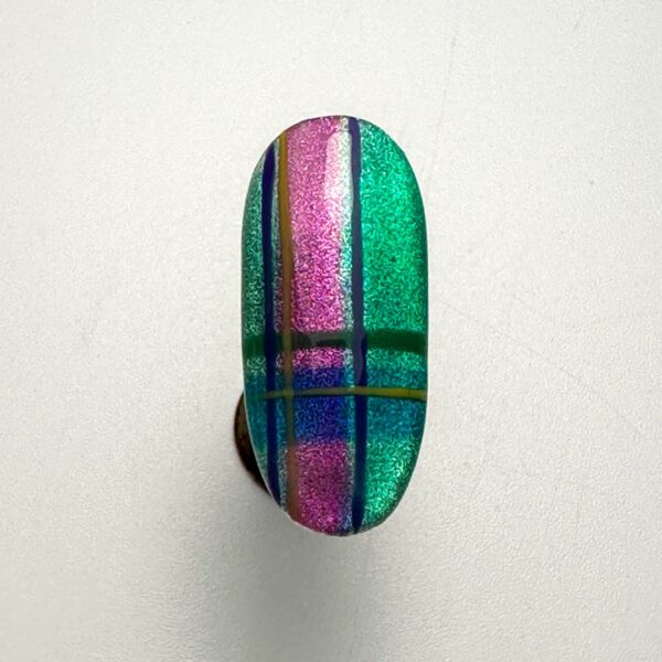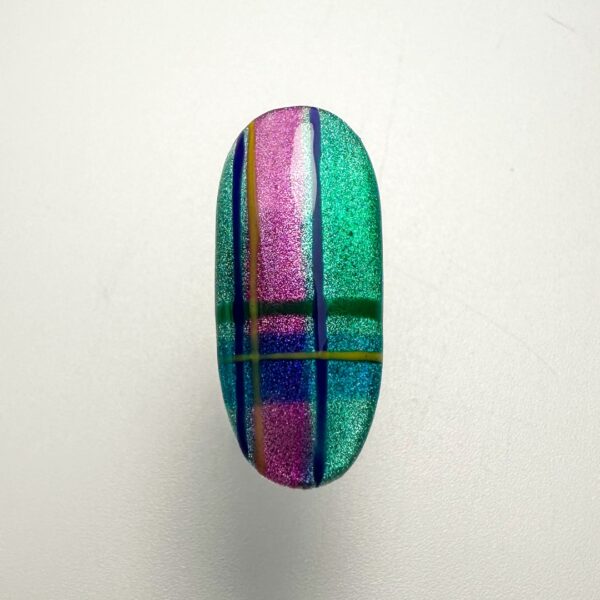 Use a yellow gel polish to paint two lines – one vertical and one horizontal – across the nails and cure. This will complete the tartan pattern.